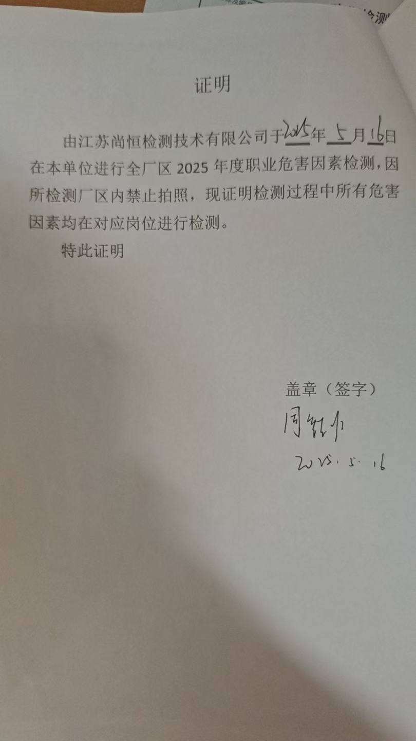 用人單位名稱 無錫市艾普諾皮帶硫化設備廠 用人單位注冊地址 無錫市錫山區東港鎮朝陽村高巷路18號 聯系人 丁宇 報告名稱及編號 職業病危害因素檢測報告 Z20250761 項目組人員 郭佳、葉菊暉、高曄、姜鑫 現場調查人員 郭佳、葉菊暉 現場調查時間 2025年9月5日 用人單位陪同人 丁宇 采樣與測量人員 高曄、姜鑫 采樣與測量時間 2025年10月11日 用人單位陪同人 丁宇 現場照片(現場調查及現場采樣與測量照片,含企業名稱或標識的合影照片) ? ? ? ? ?...