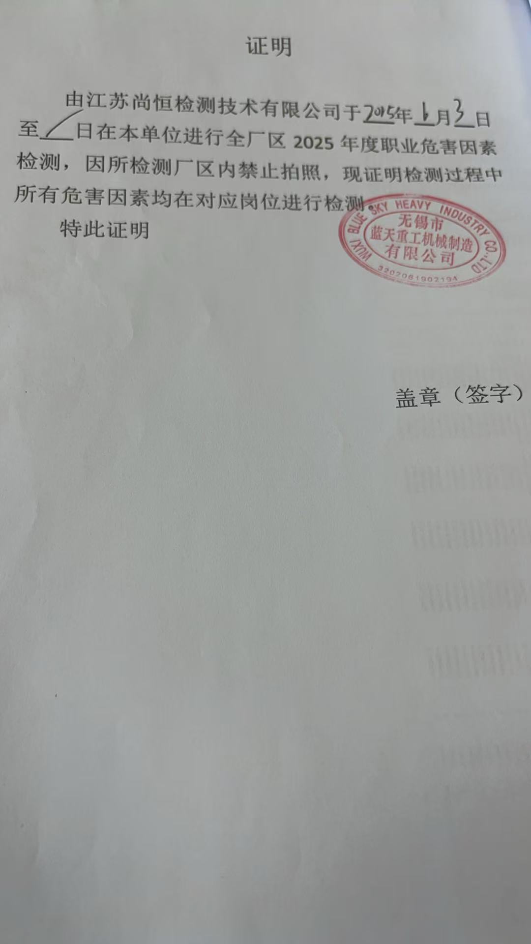 用人單位名稱 無錫市艾普諾皮帶硫化設備廠 用人單位注冊地址 無錫市錫山區東港鎮朝陽村高巷路18號 聯系人 丁宇 報告名稱及編號 職業病危害因素檢測報告 Z20250761 項目組人員 郭佳、葉菊暉、高曄、姜鑫 現場調查人員 郭佳、葉菊暉 現場調查時間 2025年9月5日 用人單位陪同人 丁宇 采樣與測量人員 高曄、姜鑫 采樣與測量時間 2025年10月11日 用人單位陪同人 丁宇 現場照片(現場調查及現場采樣與測量照片,含企業名稱或標識的合影照片) ? ? ? ? ?...