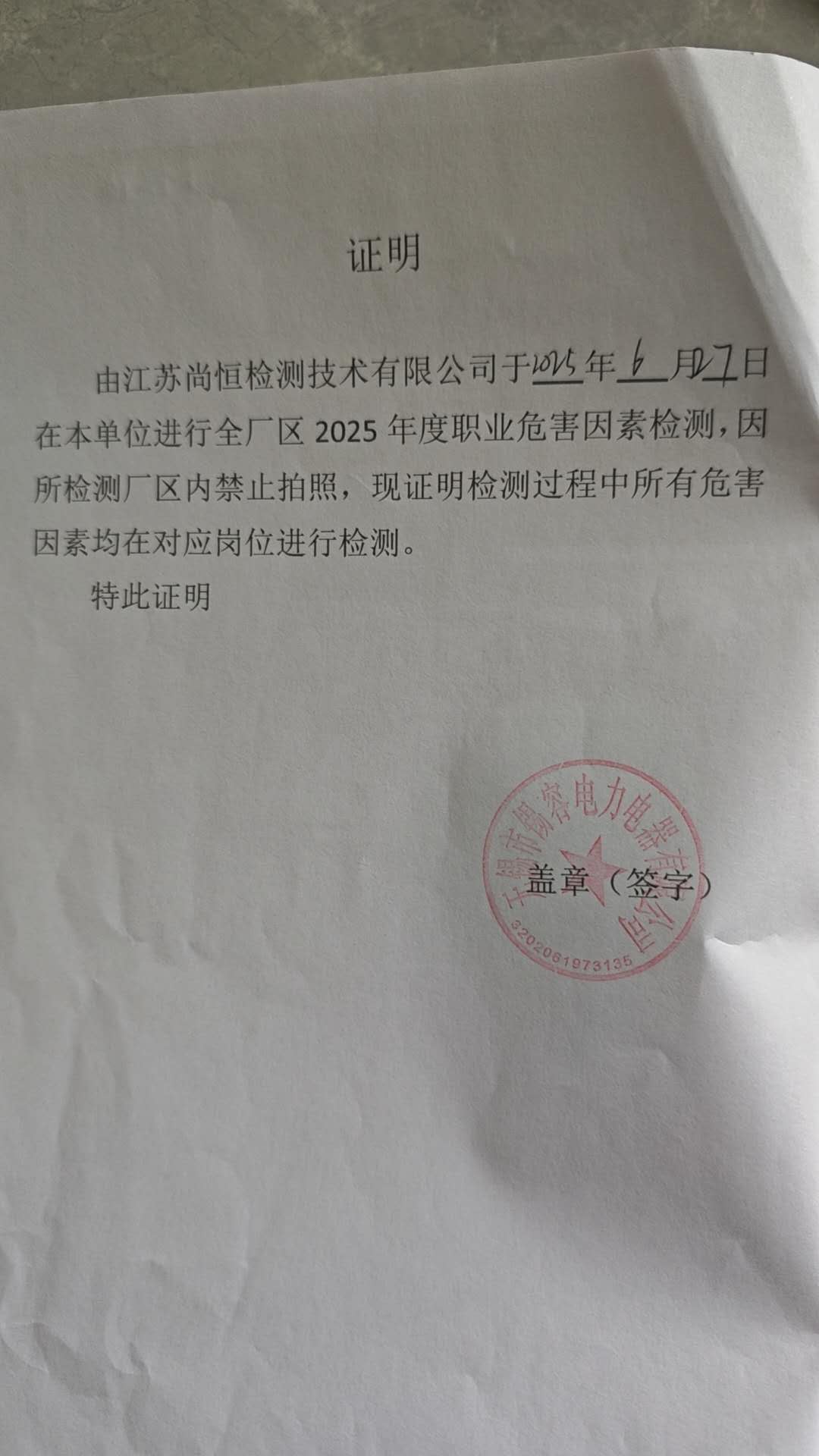 用人單位名稱 無錫市艾普諾皮帶硫化設備廠 用人單位注冊地址 無錫市錫山區東港鎮朝陽村高巷路18號 聯系人 丁宇 報告名稱及編號 職業病危害因素檢測報告 Z20250761 項目組人員 郭佳、葉菊暉、高曄、姜鑫 現場調查人員 郭佳、葉菊暉 現場調查時間 2025年9月5日 用人單位陪同人 丁宇 采樣與測量人員 高曄、姜鑫 采樣與測量時間 2025年10月11日 用人單位陪同人 丁宇 現場照片(現場調查及現場采樣與測量照片,含企業名稱或標識的合影照片) ? ? ? ? ?...