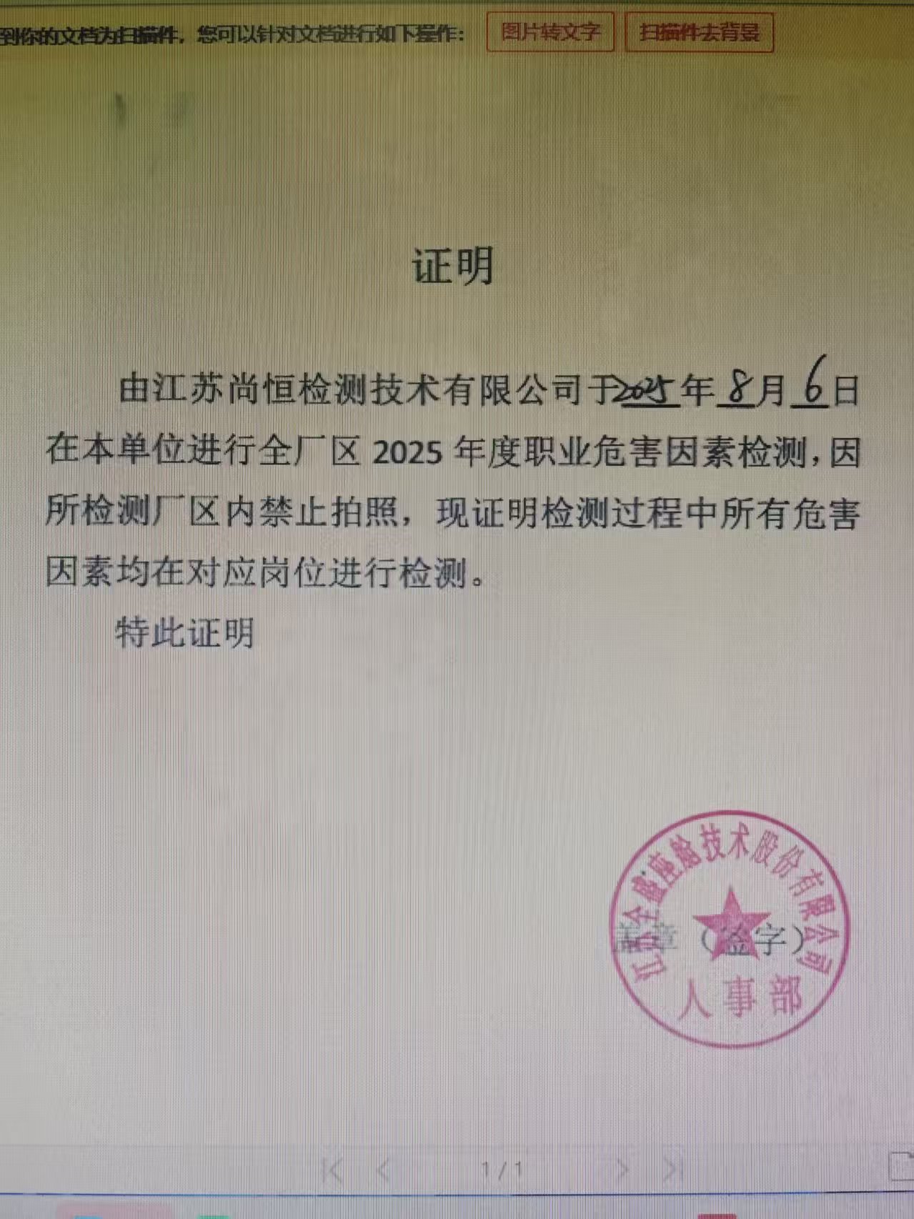 用人單位名稱 無錫市艾普諾皮帶硫化設備廠 用人單位注冊地址 無錫市錫山區東港鎮朝陽村高巷路18號 聯系人 丁宇 報告名稱及編號 職業病危害因素檢測報告 Z20250761 項目組人員 郭佳、葉菊暉、高曄、姜鑫 現場調查人員 郭佳、葉菊暉 現場調查時間 2025年9月5日 用人單位陪同人 丁宇 采樣與測量人員 高曄、姜鑫 采樣與測量時間 2025年10月11日 用人單位陪同人 丁宇 現場照片(現場調查及現場采樣與測量照片,含企業名稱或標識的合影照片) ? ? ? ? ?...