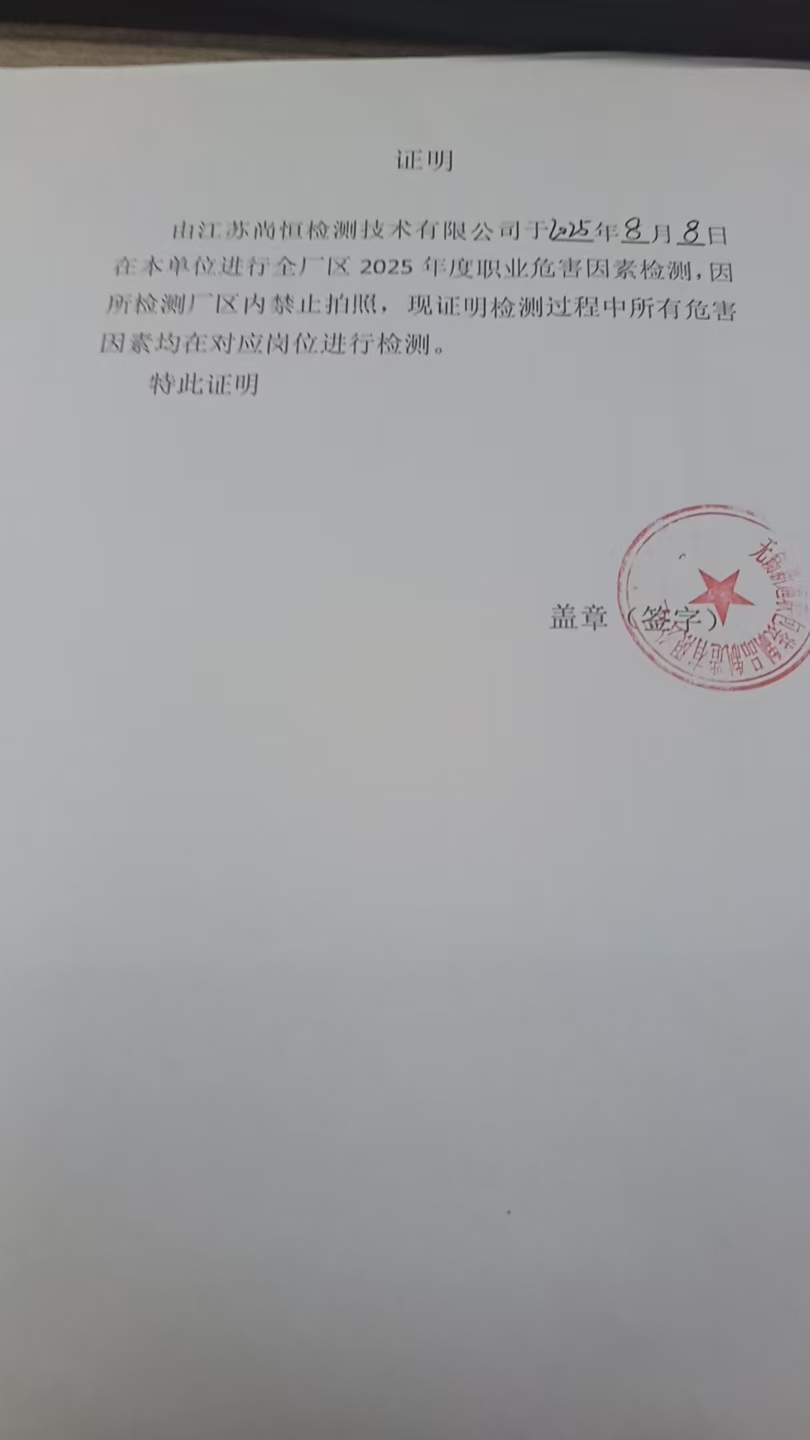用人單位名稱 無錫市艾普諾皮帶硫化設備廠 用人單位注冊地址 無錫市錫山區東港鎮朝陽村高巷路18號 聯系人 丁宇 報告名稱及編號 職業病危害因素檢測報告 Z20250761 項目組人員 郭佳、葉菊暉、高曄、姜鑫 現場調查人員 郭佳、葉菊暉 現場調查時間 2025年9月5日 用人單位陪同人 丁宇 采樣與測量人員 高曄、姜鑫 采樣與測量時間 2025年10月11日 用人單位陪同人 丁宇 現場照片(現場調查及現場采樣與測量照片,含企業名稱或標識的合影照片) ? ? ? ? ?...