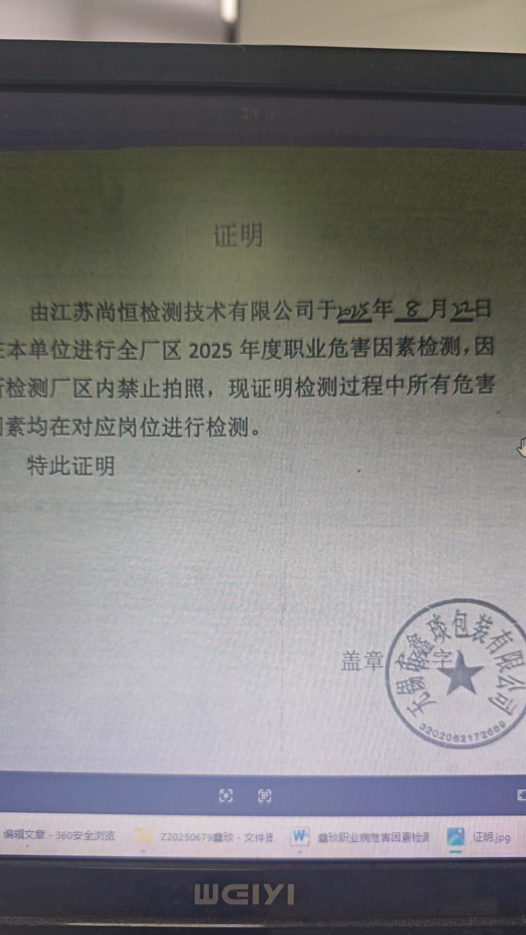 職業病危害因素檢測報告 Z20250679 |