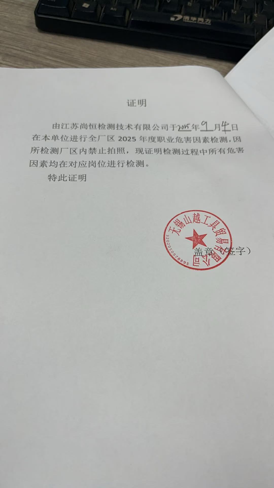 用人單位名稱 無錫市鑫和圓機械有限公司司 用人單位注冊地址 無錫市胡埭鎮丁香東路20號A棟4樓 聯系人 秦祐泇 報告名稱及編號 職業病危害因素檢測報告 Z20250820 項目組人員 耿朔辰、方佐、華佳鋮、周康 現場調查人員 耿朔辰、方佐 現場調查時間 2025年9月25日 用人單位陪同人 秦良 采樣與測量人員 華佳鋮、周康 采樣與測量時間 2025年9月30日 用人單位陪同人 秦良 現場照片(現場調查及現場采樣與測量照片,含企業名稱或標識的合影照片) ? ? ? ? ?...