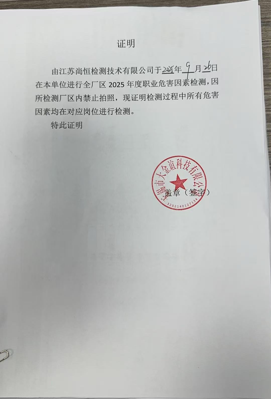 職業病危害因素檢測報告 Z20250797 |
