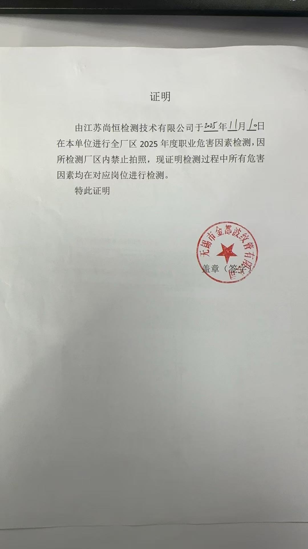 用人單位名稱 無錫鑫華朋管業有限公司 用人單位注冊地址 無錫市胡埭人民西路215號 聯系人 王永 報告名稱及編號 職業病危害因素檢測報告 Z20251033 項目組人員 丁文輝、羅燕平、趙婕、華佳鋮 現場調查人員 丁文輝、羅燕平 現場調查時間 2025年10月30日 用人單位陪同人 朱濤 采樣與測量人員 趙婕、華佳鋮 采樣與測量時間 2025年11月18日 用人單位陪同人 朱濤 現場照片(現場調查及現場采樣與測量照片,含企業名稱或標識的合影照片) ? ? ? ? ?...