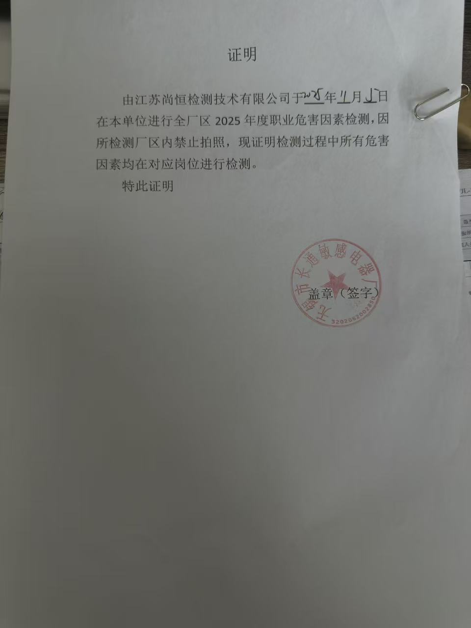用人單位名稱 無錫鑫華朋管業有限公司 用人單位注冊地址 無錫市胡埭人民西路215號 聯系人 王永 報告名稱及編號 職業病危害因素檢測報告 Z20251033 項目組人員 丁文輝、羅燕平、趙婕、華佳鋮 現場調查人員 丁文輝、羅燕平 現場調查時間 2025年10月30日 用人單位陪同人 朱濤 采樣與測量人員 趙婕、華佳鋮 采樣與測量時間 2025年11月18日 用人單位陪同人 朱濤 現場照片(現場調查及現場采樣與測量照片,含企業名稱或標識的合影照片) ? ? ? ? ?...